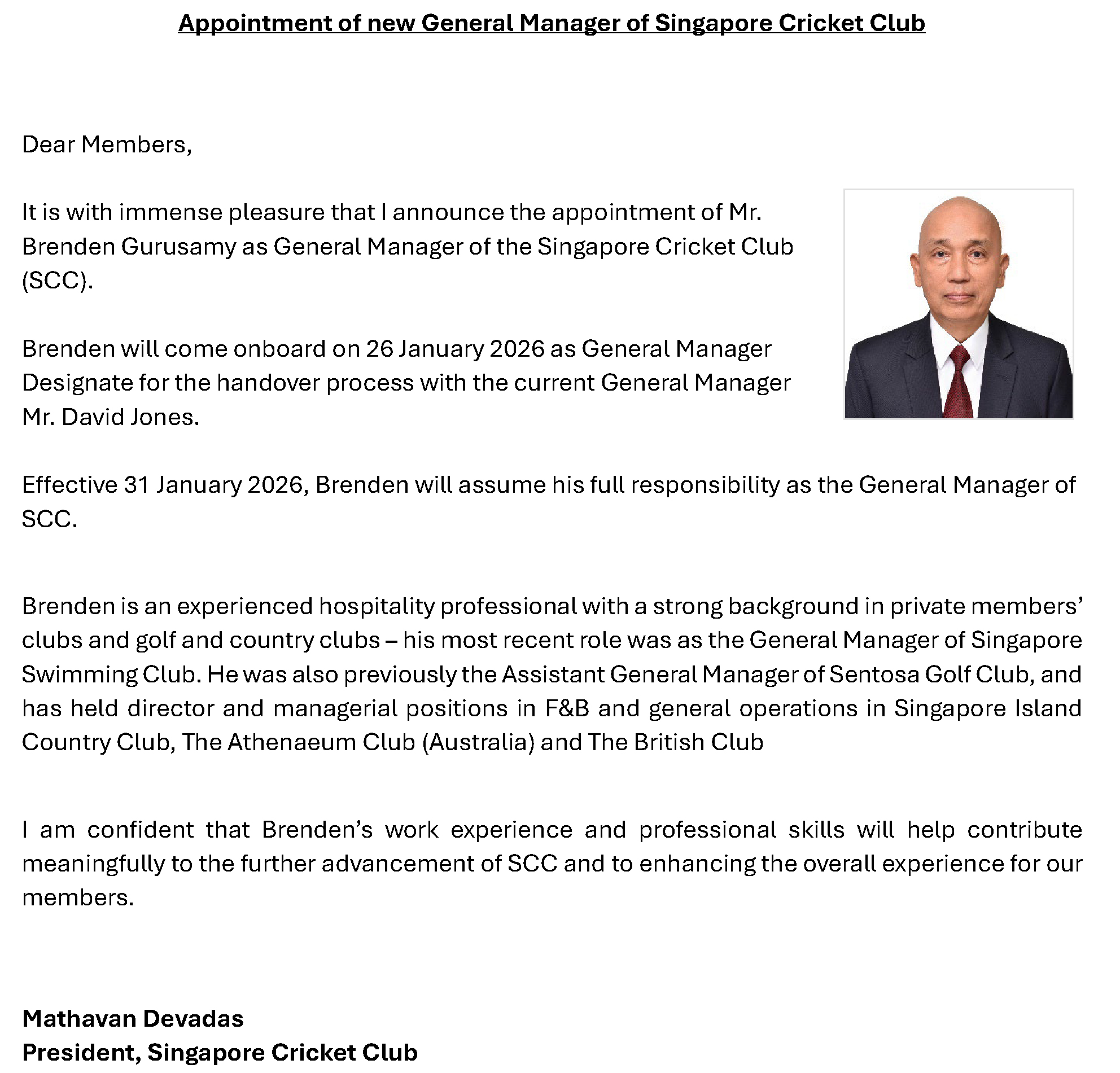 Appointment of new General Manager of Singapore Cricket Club