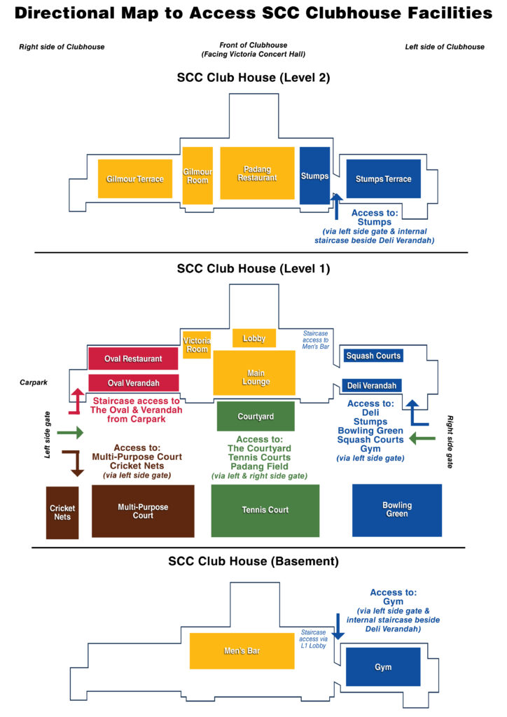 - The Courtyard, Tennis Courts, Padang Field: Via the side gates from the left and right side of the Clubhouse