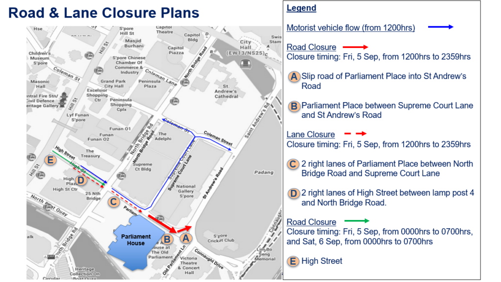 Please note that due to a Singapore Police Force (SPF) security operation at Parliament House on Friday, 5 September, the section of Parliament Place after Supreme Court Lane will be fully closed to vehicular traffic and no vehicles will be able to access SCC Clubhouse from Friday, 5 September, 1200hrs to 2359hrs.