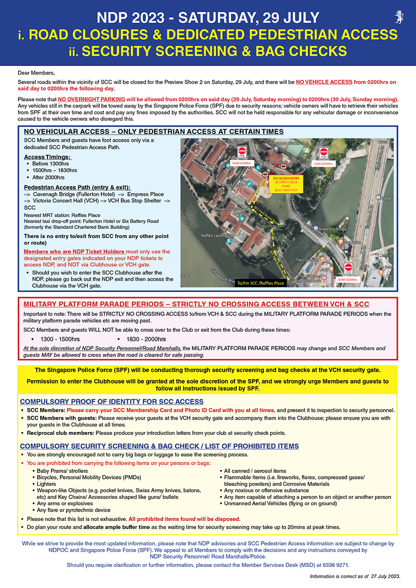 Please note that in addition to the road closures and dedicated pedestrian access for SCC, there will also be security screenings and bag checks for NDP Preview Show 2 (29 Jul) and NDP Actual Day (9 Aug).